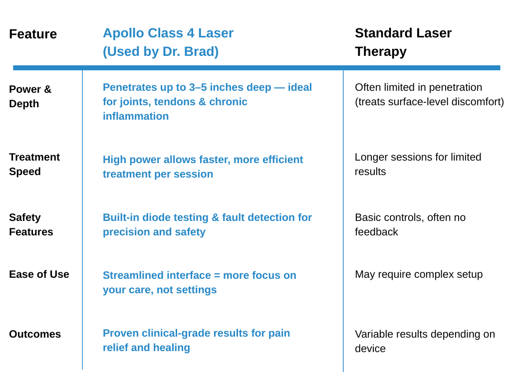 Yes. Not all cold lasers are equally powerful. Dr. Brad uses the Apollo Class IV laser — one of the most effective on the market — designed to reach deeper tissue layers quickly and safely. That means faster results, fewer sessions, and better outcomes for stubborn injuries.